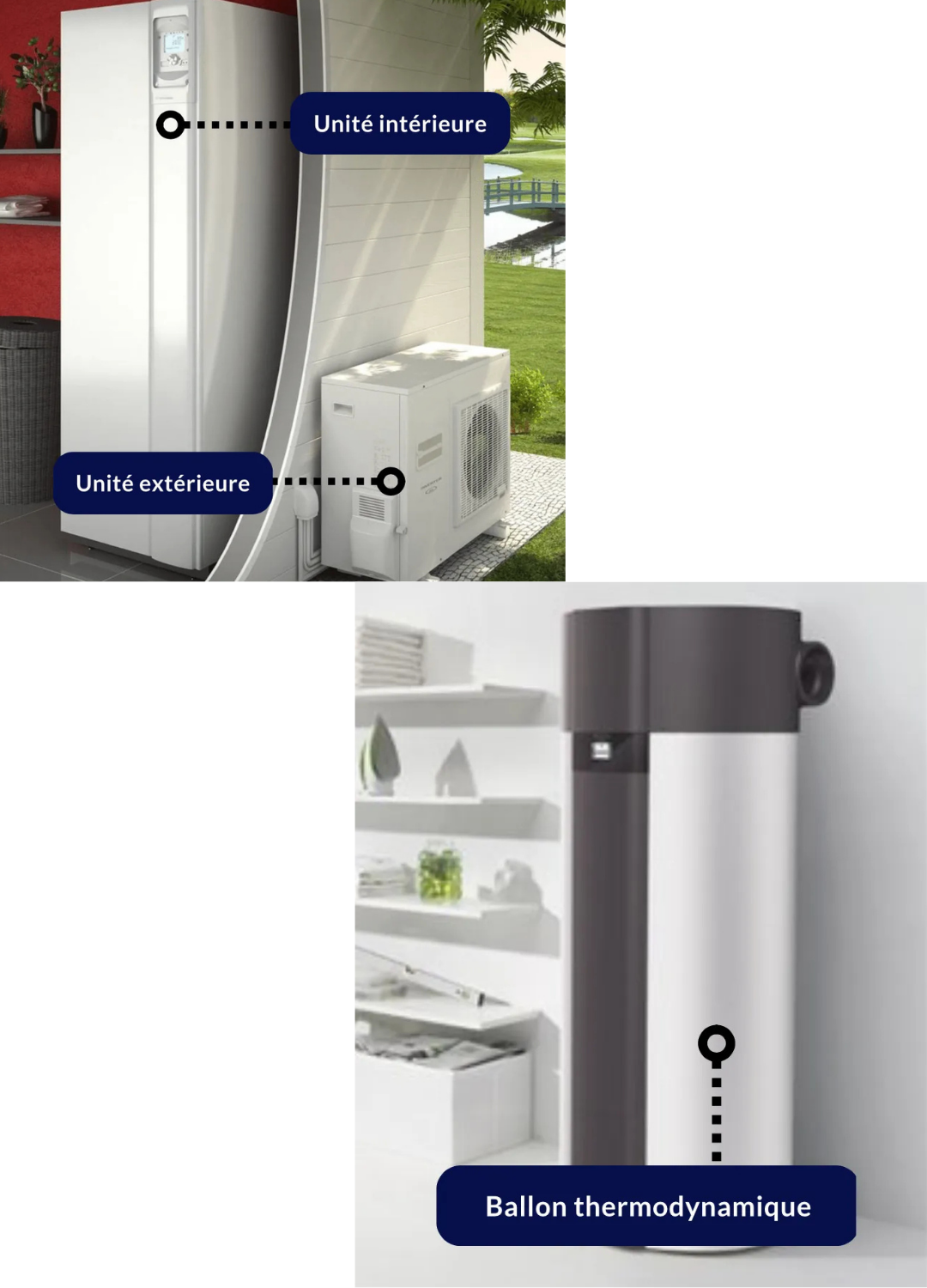 La pompe à chaleur capte les calories de chaleur présentes dans l'air extérieur pour chauffer votre logement. On compte deux éléments principaux :